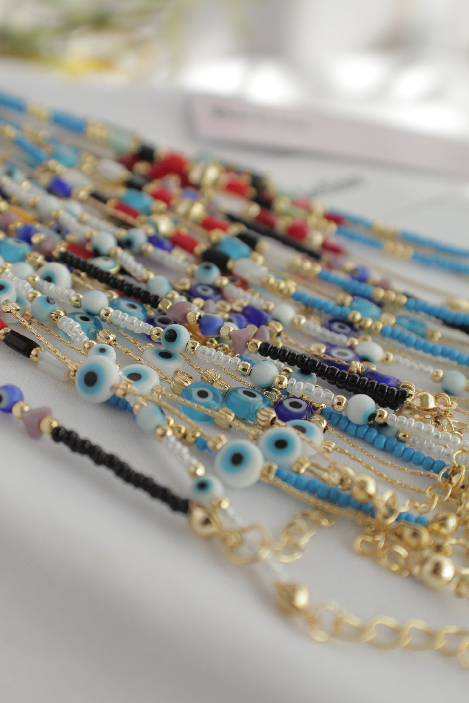 Cada pieza combina cristales, detalles dorados y el simbólico ojo turco: un elemento atemporal que se cree que atrae buena energía y protege tu camino.
