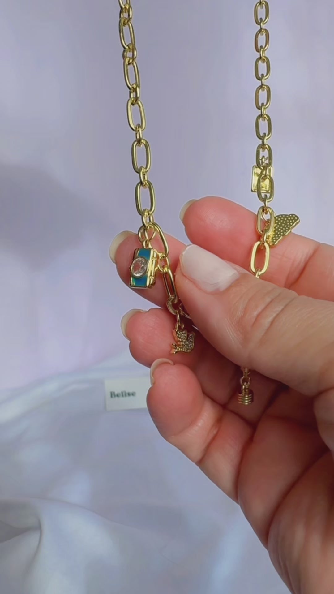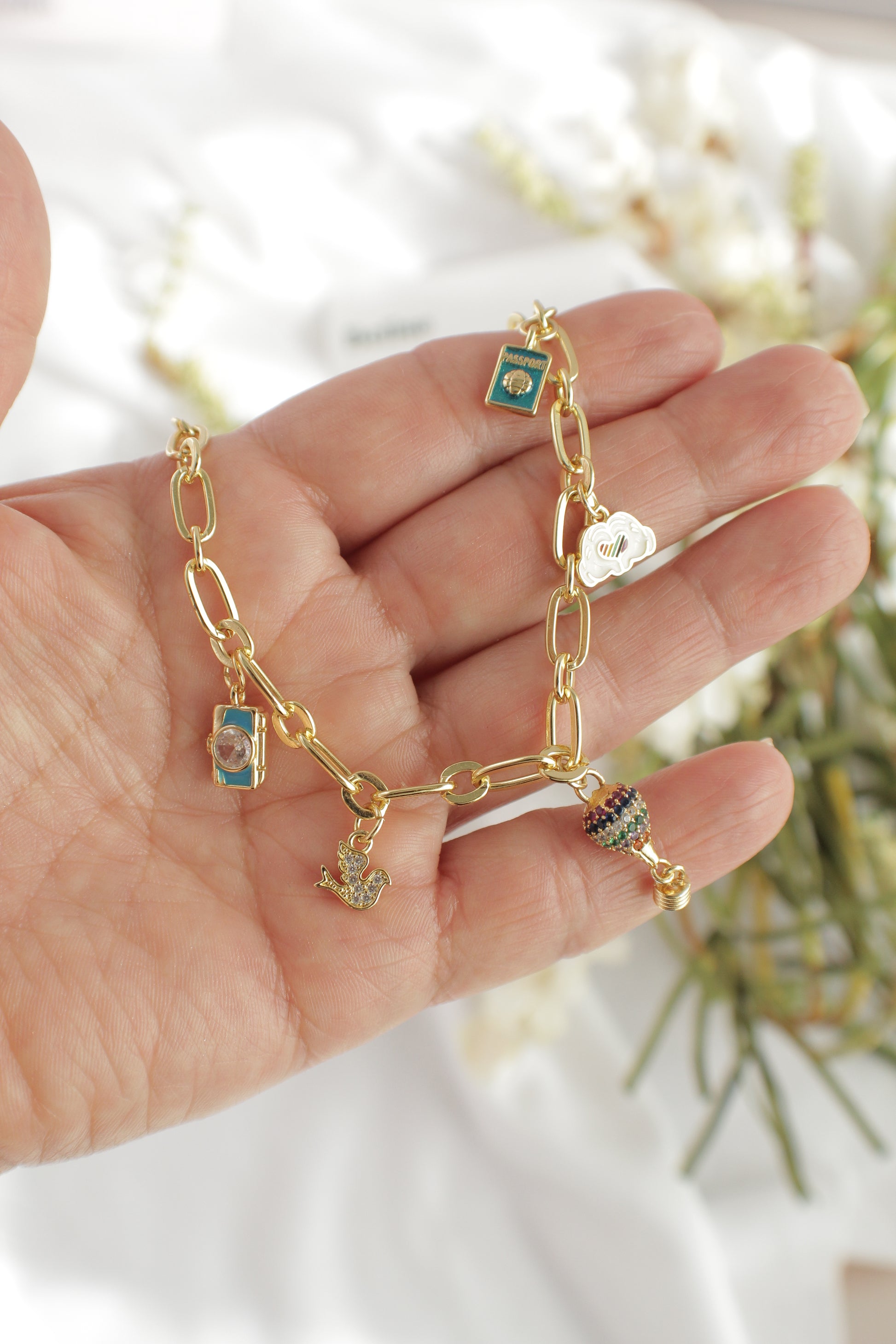 Cada charm —la cámara, el pasaporte, la paloma y la nube— simboliza momentos, recuerdos y propósitos que acompañan cada aventura.